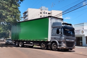 Caminhão se enrosca em fios ao passar, nesta quarta-feira, pela av. Goioerê, no centro de Campo Mourão.