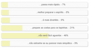 “2024 é ano de eleição municipal, portanto... não será fácil aguentar”. Essa foi a alternativa que venceu a enquete encerrada neste domingo. Teve 46% dos votos. Venceu com muita folga. Em seguindo lugar ficou “... prepare as costas para os rapinhas”, com 21%. “...É mais divertido” e “... não estranhe seu eu parecer mais simpático” empataram na terceira posição, com 9% cada. O resultado completo está no quadro acima.