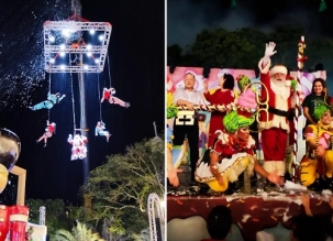 O tempo não ajudou muito, mas teve chegada do Papai Noel neste sábado em Campo Mourão. Com chuva e tudo o “bom velhinho” apareceu suspenso por um guindaste. Aliás, a chuva atrasou o início do evento e por causa dela o espetáculo “Um presente para o Noel” foi até encurtado. O público compareceu e não arredou o pé.