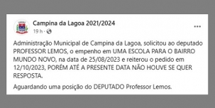 A prefeitura de Campina da Lagoa postou em redes social uma “pegada no pé” do deputado estadual Professor Lemos.