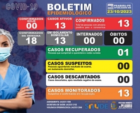 Em Peabiru, a Secretaria de Saúde voltou a divulgar nesta segunda-feira o boletim epidemiológico da covid-19 "devido aos novos casos na cidade". A publicação será semanal. O boletim desta semana anuncia 18 novos caoss de doença, sendo que 13 estão ativos. Não há nenhuma internação.