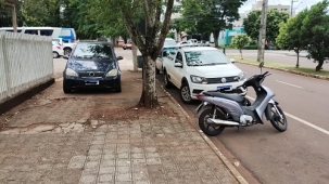 Na av. Manoel Mendes de Camargo, centro de Campo Mourão, moto estaciona no lugar de carro e carro estaciona em lugar de pedestre.