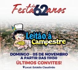 A prefeitura de Ubiratã vai servir no próximo domingo o prato típico Leitão à Campestre. Tudo dentro da programação de aniversário de 62 anos do município. A novidade é que o almoço será no estádio municipal Claudinão. Os convites estão à venda por R$ 50. Crianças de 6 a 12 anos paga R$ 20. No sábado (8h) acontece desfile cívico no centro da cidade.