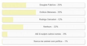 "Faltando um ano para as eleições municipais, que nome te anima mais em Campo Mourão?" Enquete encerrada neste domingo deu vitória ao prefeito de Farol, Oclécio Meneses, com 35% dos votos. O deputado Douglas Fabrício teve 25% e o ex-vice-prefeito Rodrigo Salvadori 12%. O resultado completo está no quadro acima.