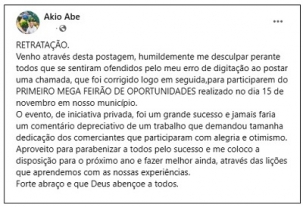 O prefeito de Quarto Centenário, Akio Abe, postou nas redes sociais um pedido de desculpas por causa de um ‘erro de digitação’.