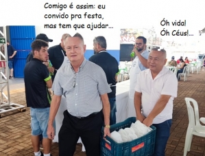 O clic é deste domingo, em Janiópolis, onde a Festa da Leitoa Fuçada foi retomada como parte da programação do aniversário da cidade. Nos preparativos do prato típico, o prefeito Ismael Dezanoski ajudou na hora de carregar os pratos. Mas não ajudou sozinho, não. Contou com uma mãozinha do prefeito de Quarto Centenário, Akio Abe. Ah, companheiro é companheiro...
