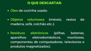 Acontece neste sábado, das 8h às 15h, mais uma ação da campanha “Campo Mourão - Lixo Zero”. É para recolher resíduos volumosos e eletrônicos, além de óleo de cozinha usado (veja acima o que pode). Haverá dois pontos de recebimento – um na Sema (ao lado da Ciretran) e outro no ginásio do Lar Paraná.