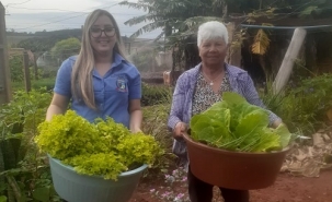 Olha aí a dona Expedita. Aos 70 anos, ela é voluntária na Horta Comunitária de Mamborê. Toda manhã, levanta cedo para colher verduras frescas. Nesta quarta-feira, por exemplo, colheu verduras destinadas ao Abrigo Provisório da Criança e Adolescente e à Casa Lar dos Idosos.
