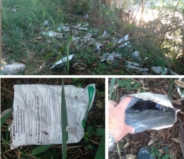 “É impressionante. Como a estupidez humana, não tem limites! Diversas embalagens de veneno, dispensadas irresponsavelmente em uma área de proteção ambiental. Muitas com água. Cheiro forte no local. Rua: ifnal da João Xavier Padilha (jardim Voidelo)”.