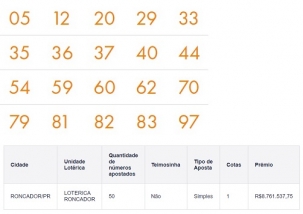 Uma aposta feita na Lotérica Roncador, em Roncador, foi a única em todo o Brasil a acertar as 20 dezenas da Lotomania sorteadas nesta sexta-feira. Resultado? Faturou um prêmio de R$ 8,7 milhões. Também saiu para Roncador um prêmio de R$ 212,6 mil por ser a única aposta com zero acertos.