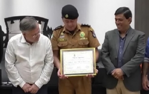 A Câmara de Campo Mourão fez sessão solene nesta terça-feira para entregar moção ao 11º Batalhão da Polícia Militar. Detalhe: a homenagem tinha sido aprovada em 2017 por proposição do então vereador Sidnei Jardim. Por isso mesmo, Jardim fez a entrega junto com o prefeito Tauillo Tezelli ao comandante do 11º BPM, tenente-coronel Willian Dieimes Silveira.
