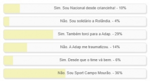 “Você vai torcer pelo Nacional, que trocou Rolândia por Campo Mourão?” Enquete encerrada neste domingo deu vitória à alternativa “Não. Sou Sport Campo Mourão”, com 36% dos votos. “Sim. Também torci para a Adap” teve 29% e ficou em segundo, seguida de “Não. A Adap me traumatizou”, com 14%. Já 10% se disseram “Nacional desde criancinha”. O resultado completo está no quadro acima.