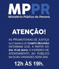 Campo Mourão – O Ministério Público começa nesta quarta-feira a atender em novo horário. Será das 12h às 19h. A medida segue alinhamento com o Tribunal de Justiça (fórum).