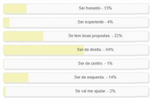 “O que pesa para você decidir seu candidato?” Enquete foi encerrada neste domingo. Vitória para a alternativa “Ser de direita”, com 44% dos votos. “Ter boas propostas” ficou em segundo, com 22%. “Ser de esquerda” apareceu em terceiro, com 14%. “Ser honesto” teve 13% dos votos. O resultado completo está no quadro a acima