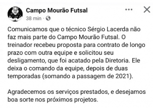 Sérgio Lacerda não é mais técnico do Campo Mourão Futsal.