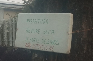 Placa colocada em árvore na rua Santa Catarina abaixo da av. José Custódio de Oliveira.