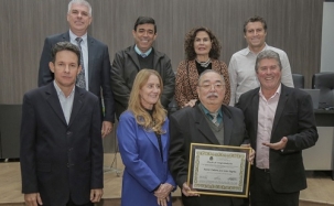 Teve sessão solene da Câmara de Campo Mourão nesta segunda-feira à noite. Foi para a entrega de noção para o pastor Takemi José Luiz Tagata, da igreja Presbiteriana Renovada. A entrega foi feita pelo vereador autor, Paulo PIlatte, e pelo diretor do Procon, Sidnei Jardim, que representou o prefeito Tauillo Tezelli. Quatro vereadores participaram da sessão.