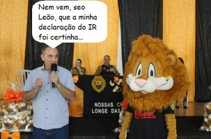 O clic é de Peabiru, onde aconteceu esta semana a cerimônia de formatura do Proerd. O prefeito Júlio Frare prestigiou o evento e, na hora do discurso, ficou ao lado do Leão que é mascote do programa. E que fique claro, o leão do Imposto de Renda é outro...