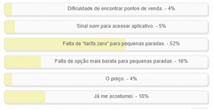 “O que ainda te irrita na Zona Azul de Campo Mourão”. Enquete encerrada neste domingo deu vitória (com folga) à alternativa “Falta de ‘tarifa zero’ para pequenas paradas”, com 52% dos votos. Em segundo lugar ficou “Já me acostumei”, com 18%. Em terceiro veio “Falta de opção mais barata para pequenas paradas”, com 16%; O resultado completo está no quadro acima.