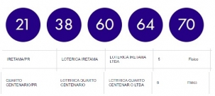 A Quina de São João sorteou neste sábado um prêmio de R$ 229,9 milhões. Três apostas acertaram as cinco dezenas sorteadas e cada uma garantiu R$ 76,3 milhões. Os sortudos são de Gouveia/MG. Viamão/RS e São José do Rio Preto/SP. A quadra teve 1.714 apostas ganhadoras e cada uma ficou com R$ 11 mil. Duas delas são da região – uma de Iretama (lotérica Iretama) e outra de Quarto Centenário (lotérica Quarto Centenário).