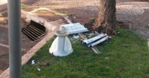 “Vaso sanitário jogado no canteiro central da av. Irmãos Pereira, próximo à esquina com a rua Brasil”.