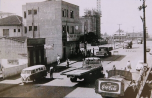 “Foto do ano centro de Campo Mourão, nos anos 60 (provavelmente 1967), mostra que não é de hoje que caminhões deitam e rolam pela área central. Numa única imagem aparecem cinco caminhões na rua Brasil. Repare, ao fundo, a Catedral em obras. A foto faz parte do acervo do Museu Municipal e está em exposição até o próximo dia 29”.