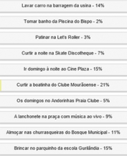 Lavar o carro na barragem da usina tem 14% e almoçar nas churrasqueiras do Bosque Municipal, 11%.