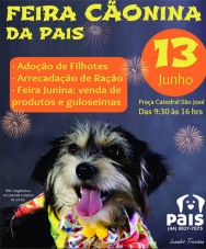 Acontece neste sábado a Feira Junina da Pais, a entidade que cuidada de cães abandonados em Campo Mourão. A “Feira Caonina” vai até às 16h30, na praça São José. Tem adoção de filhoetes, arrecadação de ração e vendas de produtos e guloseimas em prol dos “focinhos carentes” atendidos pela Pais.