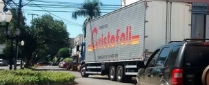 "Caminhão baú faz contorno na av. Manoel Mendes de Camargo, no centro de Campo Mourão, para depois parar em fila dupla. A foto é de segunda-feira, por volta das 12h30. Em tempo: a empresa do caminhão não é de Campo Mourão".
