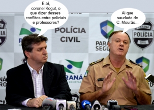 O clic é desta quarta-feira, em Curitiba, onde o comandante geral da Polícia Militar do Paraná, coronel César Kogut, concedeu entrevista coletiva para falar do cerco policial aos professores na capital do Estado. Kogut atuou por cerca de 15 anos no batalhão de Campo Mourão. Ah, aqui era bem mais tranquilo, não era?...