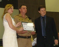Teve entrega de moções durante a sessão da Câmara de Campo Mourão desta terça-feira. Os homenageados foram o cabo Giumar Fialho Guimarães e soldado Celso Aparecido da Silva, do 11.o BPM. As moções, aprovadas por unanimidade, foram propostas pelo presidente Pedrinho Nespolo. A prefeita Regina Dubay participou da sessão. O soldado Celso discursou em nome da dupla e fez um discurso bem rapidinho. Ufa!...