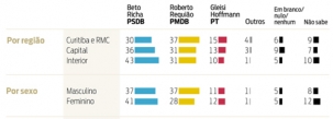 Na Região Metropolitana de Curitiba inteira é Requião quem lidera, com 37%, contra 30% de Richa e 15% de Gleisi Hoffmann.