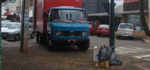 Caminhão usa a calçaada para fazer descarta de mercadorias em Campo Mourão. Isso em plena esquina da rua Harrison José Borges com a av. Manoel Mendes de Camargo, por volta das 11h desta quarta-feira.