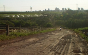 "A estrada para o Barreiro das Frutas está muito ruim. Tem buracos enormes ao lado do Bosque Municipal. Os motociclistas correm risco de levar tombos. A foto mostra também irrigação numa linda horta que abastece nossa Campo Mourão. Fraterno Maria Nunes