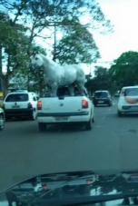 No centro de Campo Mourão, flagrante mostra "cavalo" (de plástico) sendo transportado na caçamba de uma Saveiro. Marcio V. Martins