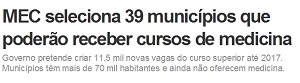 A confirmação das 39 cidades que ganharão curso de medicina foi destaque nesta quinta-feira nos principais meios de comunicação do País. Acima estão as manchetes da Gazeta do Povo, do O Estado de S. Paulo, do UOL e do G1. Isso só na internet. Campo Mourão é um dos 39 municípios escolhidos. E que fique claro: Paranavaí não está na lista...