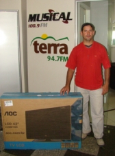 O pedreiro Wilton Rogério Madeira recebeu nesta terça-feira a TV de 42" que ganhou por ter acertado os 3 a 0 que a Holanda aplicou no Brasil na Copa do Mundo. Foi o último prêmio do bolão promovido pela Musical FM. "Depois dos 7 a 1 da Alemanha, não podia vir coisa boa", explicou Madeira sobre a aposta contra a seleção brasileira. A Musical ofereceu prêmios para todos os sete jogos do Brasil. Só a goleada da Alemanha não teve acertadores. Também, 7 a 1 nem o mais otimista dos argentinos...