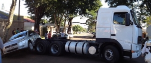 Acidente "diferente" na manhã desta quarta-feira. Na rua na Rocha Pombo, quase esquina com av. Manoel Mendes. A carreta perdeu o freio ao tentar atravessar a avenida, voltou de ré uns 30 metros e atingiu em cheio um carro estacionado.