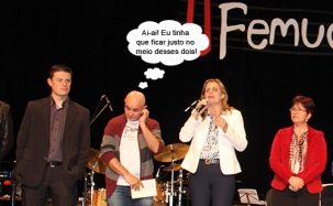 O clic é desta quarta-feira, no Teatro Municipal, onde aconteceu a abertura do 2º Festival de Música de Campo Mourão. A prefeita Regina Dubay e o presidente da Câmara, Pedrinho Nespolo, estiveram por lá. A secretária Sônia Singer (Cultura) também. Agora, olha só a situação do Chico Pinheiro, que teve que ficar bem no meio da prefeita e do vereador. E sem um escudo de proteção, nem nada...