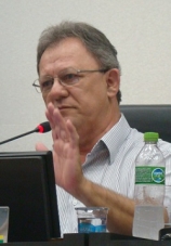 Edson Battilani (PPS), vereador, explicando que médico, em geral, não tem como se dedicar integralmente ao cargo; durante audiência pública que discutiu as condições de trabalho nos postos de saúde de Campo Mourão; nesta quinta-feira.