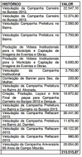 Também foram feitas campanhas do Prefeitura no Bairro (R$ 21,8 mil) e o aniversário da cidade (R$ 20,5 mil).