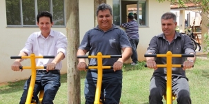 O clic é da academia da terceira idade instalada na praça Alvorada, no Lar Paraná. O coordenador geral Carlos Augusto Garcia (centro) e os vereadores Toninho Machado e Edilson Martins foram dar uma olhada no local onde será instalado o posto do Detran. Aí aproveitaram para um exerciciozinho. Nenhum deles está na terceira idade, mas de graça, né?...