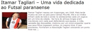 O site da Federação Paranaense de Futsal publicou uma homenagem ao mourãoense Itamar Tagliari. "Uma vida dedicada ao futsal parananese", diz o título. Segundo o texto, em mais de 50 anos dedicados à modalidade, Itamar foi jogador, técnico, professor, apoiador e dirigente "sempre respeitado". Ele também foi secretário de Esportes e vereador por dois mandatos, mas isso deixa a Boca Santa, que é focada na política, que fale, né?...