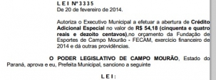Da série "A gente mata a cobra e mostra a bicha morta", olha aí a reprodução de parte da lei municipal que autoriza a prefeitura a abrir um crédito adicional especial de R$ 54,18. A publicação saiu no fim de semana no "Órgão Oficial". Para virar lei, é preciso que projeto seja enviado à Câmara, discutido e relatado em reuniões de comissões, votado em plenário, devolvido à prefeitura, sancionado e publicado pelo executivo. Típico caso em que o molho sai mais caro que o peixe...