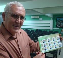 Reverendo Richard Dickerson, norte-americano de nascimento e brasileiro de coração, ao mostrar os selos comemorativos pelos 40 anos de seu casamento; em reunião da Acicam, nesta quarta-feira.