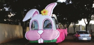 Na hora de comemorar a Páscoa com a criançada, a prefeitura de Juranda ganhou o prêmio "originalidade". Ao invés de "coelhinho", quem apareceu por lá foi o "coelhão da Páscoa". É um ônibus conversível que ganhou "cara de coelho" e levou as crianças para um passeio pela cidade. O prefeito Bento Batista participou do festa. Agora cá pra nós: dá pra imaginar o tamanho da cenoura?...