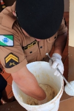 Olha aí o comandante do destacamento da Polícia Militar de Campina da Lagoa, cabo Belasco, metendo a mão na massa. Ou melhor: na banha! Foi nesta quinta-feira, durante uma operação policial numa boca de fumo. E não é que o balde de banha estava recheadinho de crack? Ah, já não se faz mais banha de porco como antigamente...
