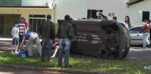 Aconteceu de novo. Batida de carro em Campo Mourão com veículo tombado. Desta vez foi na av. José Custódio de Oliveira, por volta das 9h desde domingo. O Agile, com placa de Mamborê, chocou-se com um Polo que estava estacionado e "virou". Duas pessoas tiveram ferimentos leves. Agora, cá pra nós: que diacho que os carros não querem ficar mais com as rodas no chão nesta cidade?...