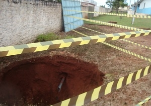 Mamborê - Devido às chuvas, uma fossa desativada no pátio da escola estadual Rui Barbosa desmoronou. A direção informou que não tinha conhecimento da existência da fossa e que providências estão sendo tomadas para que ela seja aterrada. Foto: TR Notícias