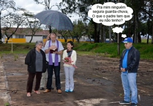 O clic é de Goioerê, onde a comissão pró-Moradas Águas Claras realizou no fim de semana a bênção do terreno onde será construído o lar dos idosos. O prefeito Beto Costa participou, assim como a juíza Fabiano Matie Sato, que é a idealizadora do projeto. Agora, direito a "assessor" segurando guarda-chuva, só o padre Ivan Walter teve...